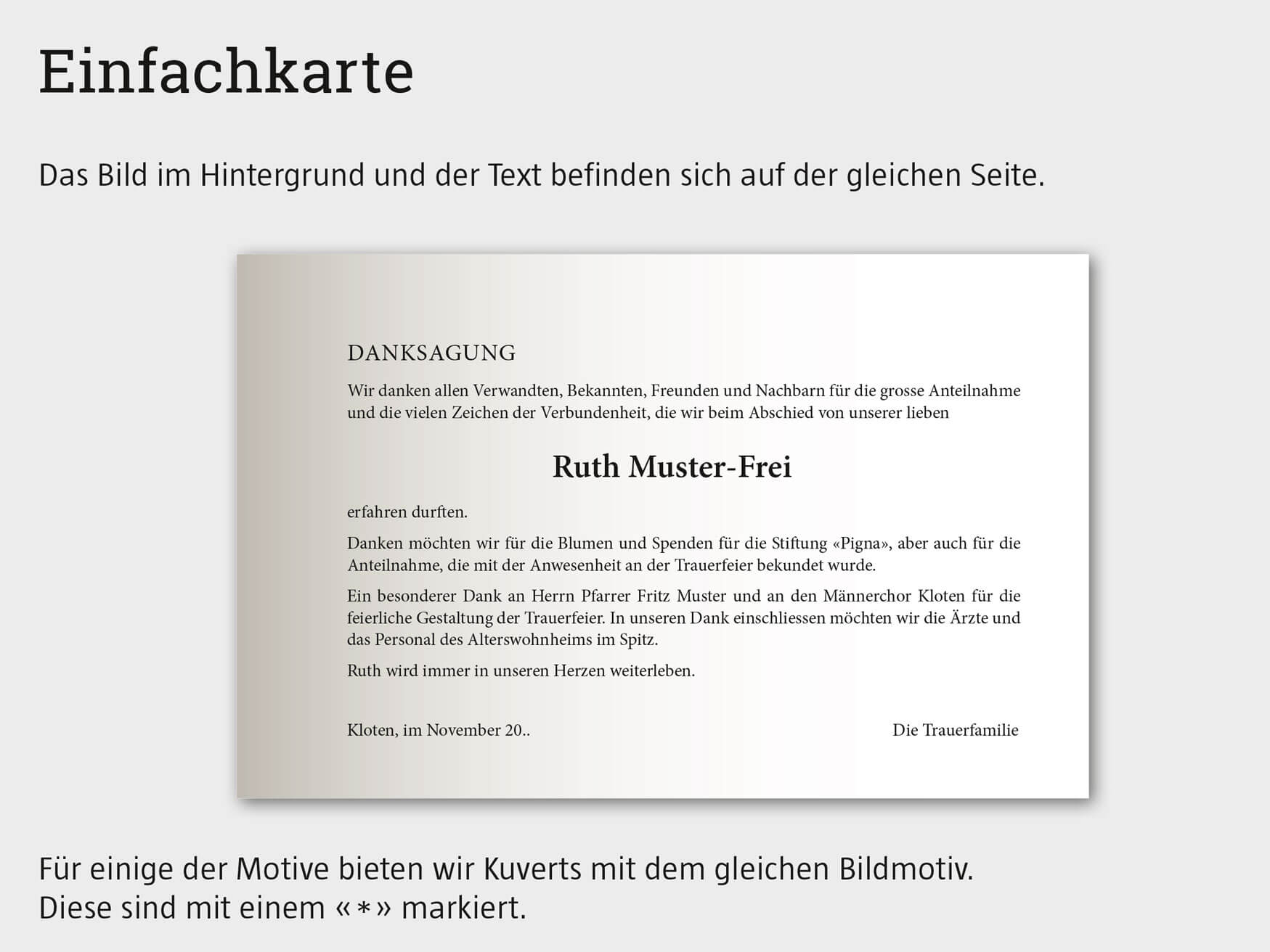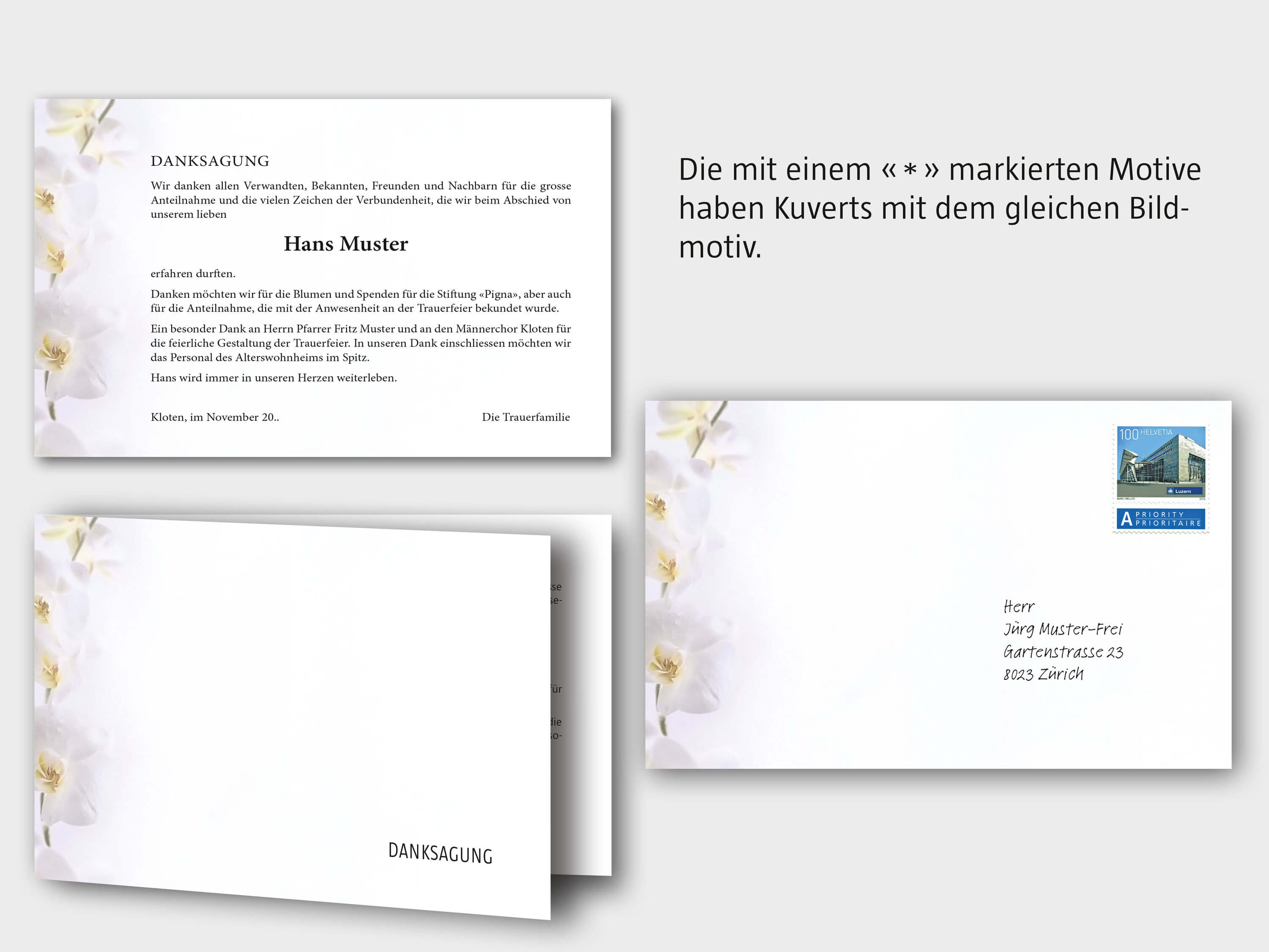 Wählen und bestellen Sie aus einer grossen Auswahl eine Danksagung bzw. Dankeskarte mit passenden Kuverts – gerne gestalten, drucken und versenden wir nach Ihren Wünschen. Während dem Bestellprozess werden Sie durch alle Teile geführt und erhalten auch Textbeispiele, die bei der Formulierung der Dankesworte helfen.